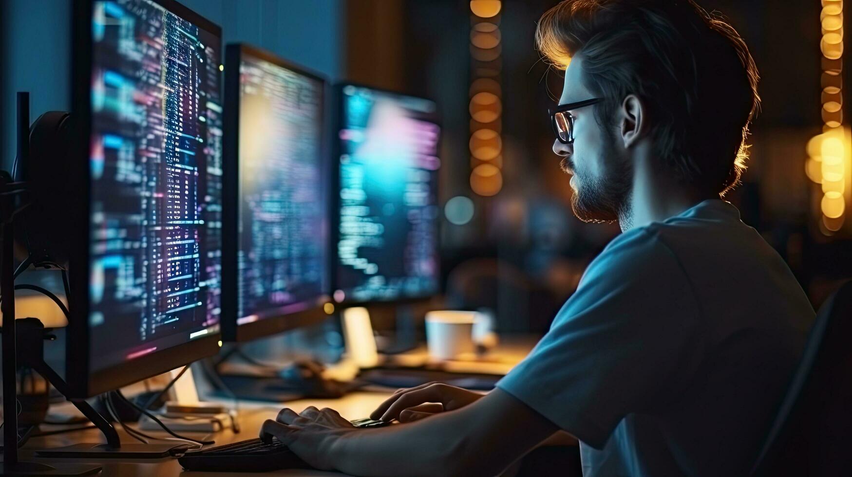 Young male software developer writes a program while working in the office. photo
