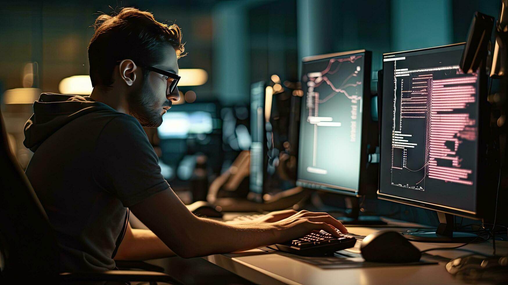 Young male software developer writes a program while working in the office. photo