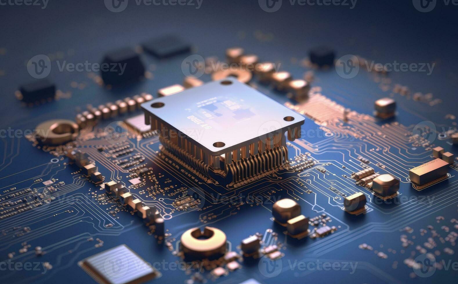 Board with chip and circuits, technology concept, digital illustration. Generative AI Pro Photo