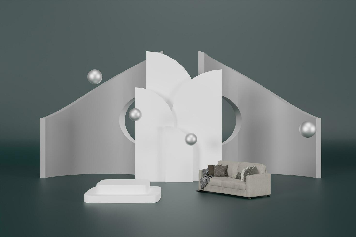 The product showcase is enhanced by a set of geometric shapes that complement the podium and sofa set.3d rendering. Free Photo