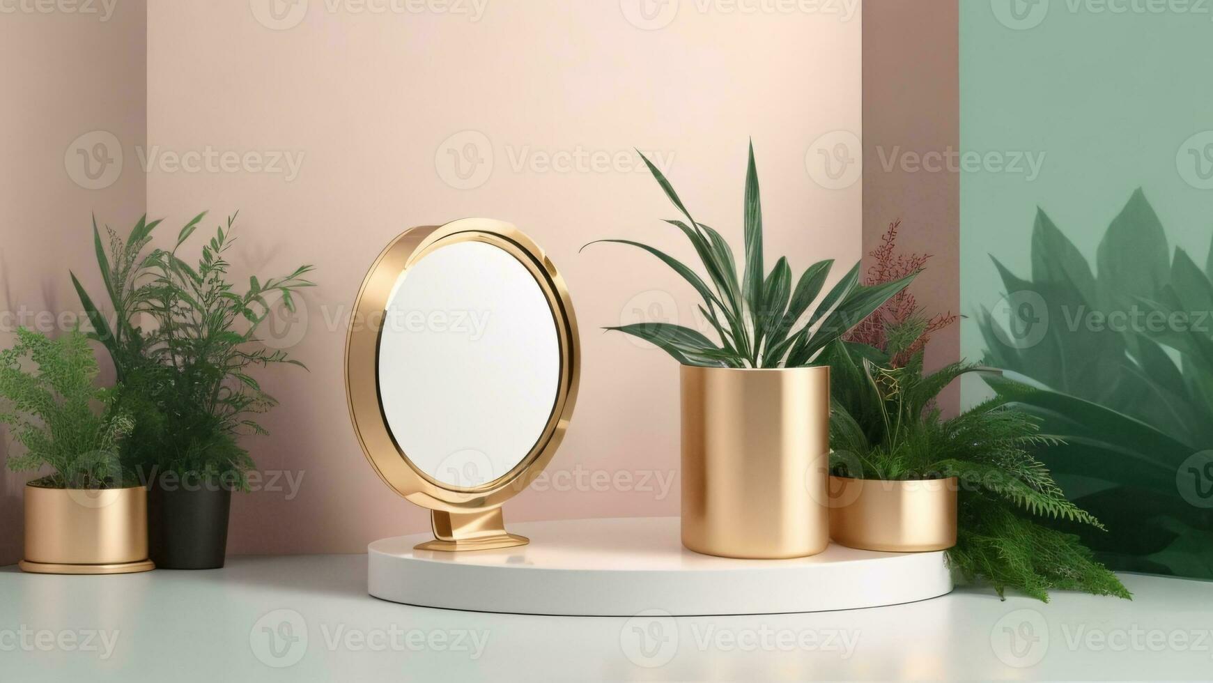 minimal display podium for product design, Pedestal with round gold mirror, 3d render ai generated Pro Photo