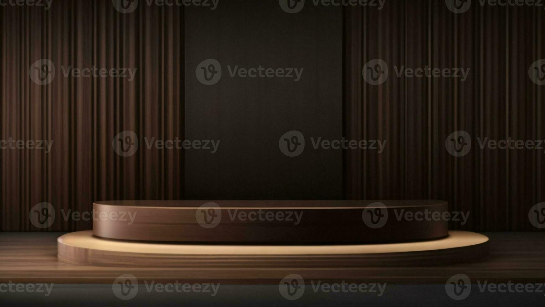 dark wooden background with podium for product presentation, luxury minimalistic design, 3d render ai generated Pro Photo