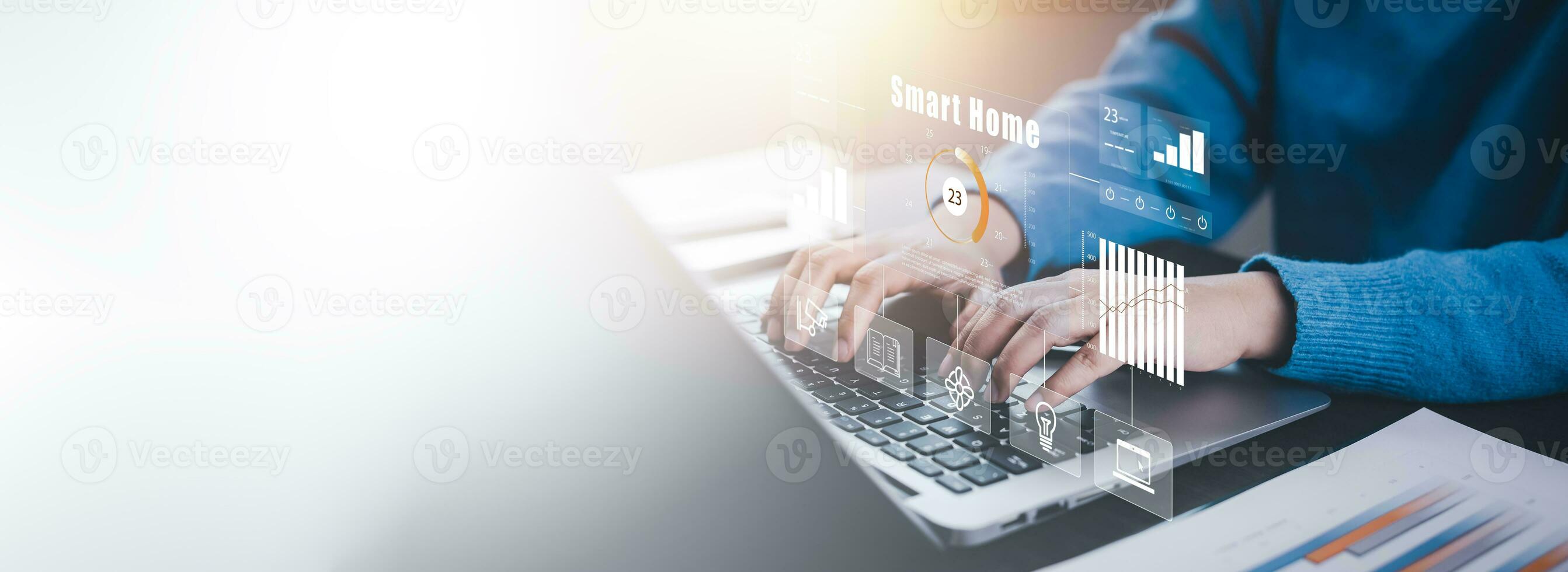 Hand using AI smart tablet with smart home app on the room, circular interface of the smart home automation assistant on the virtual screen and user touches the button, smart home digital interface Pro Photo