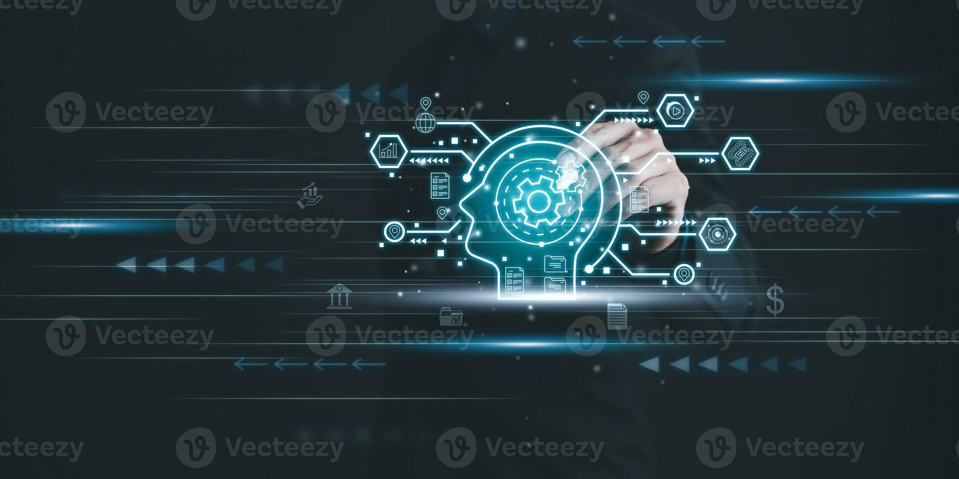 Brain working of AI System concept, developed by Open AI generates, AI tech, Business people show virtual graphics Global Internet with AI, Artificial Intelligence, Futuristic technology,Robots online Pro Photo