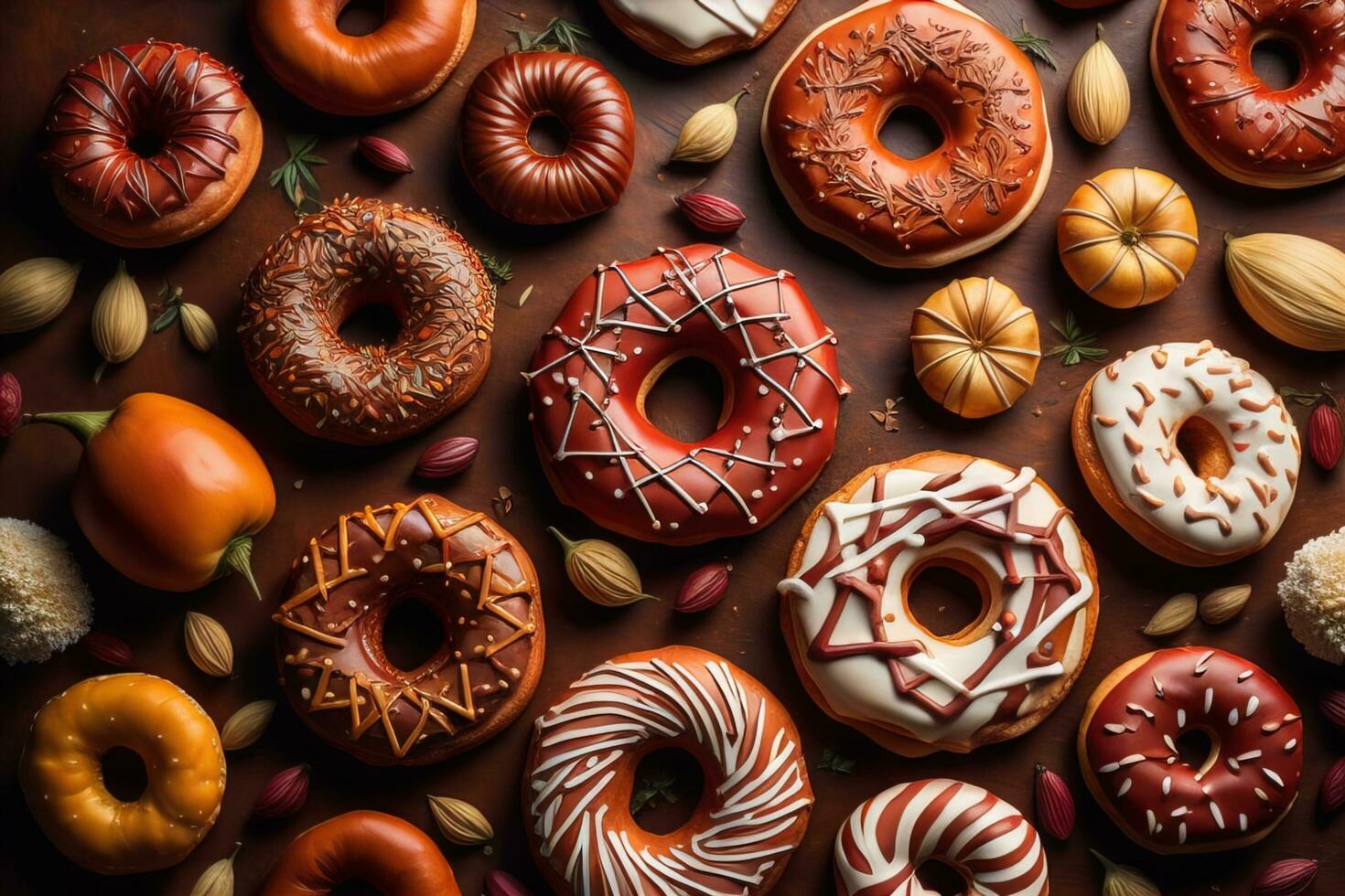 Variety of donuts on a solid color background. Top view. ai generative photo
