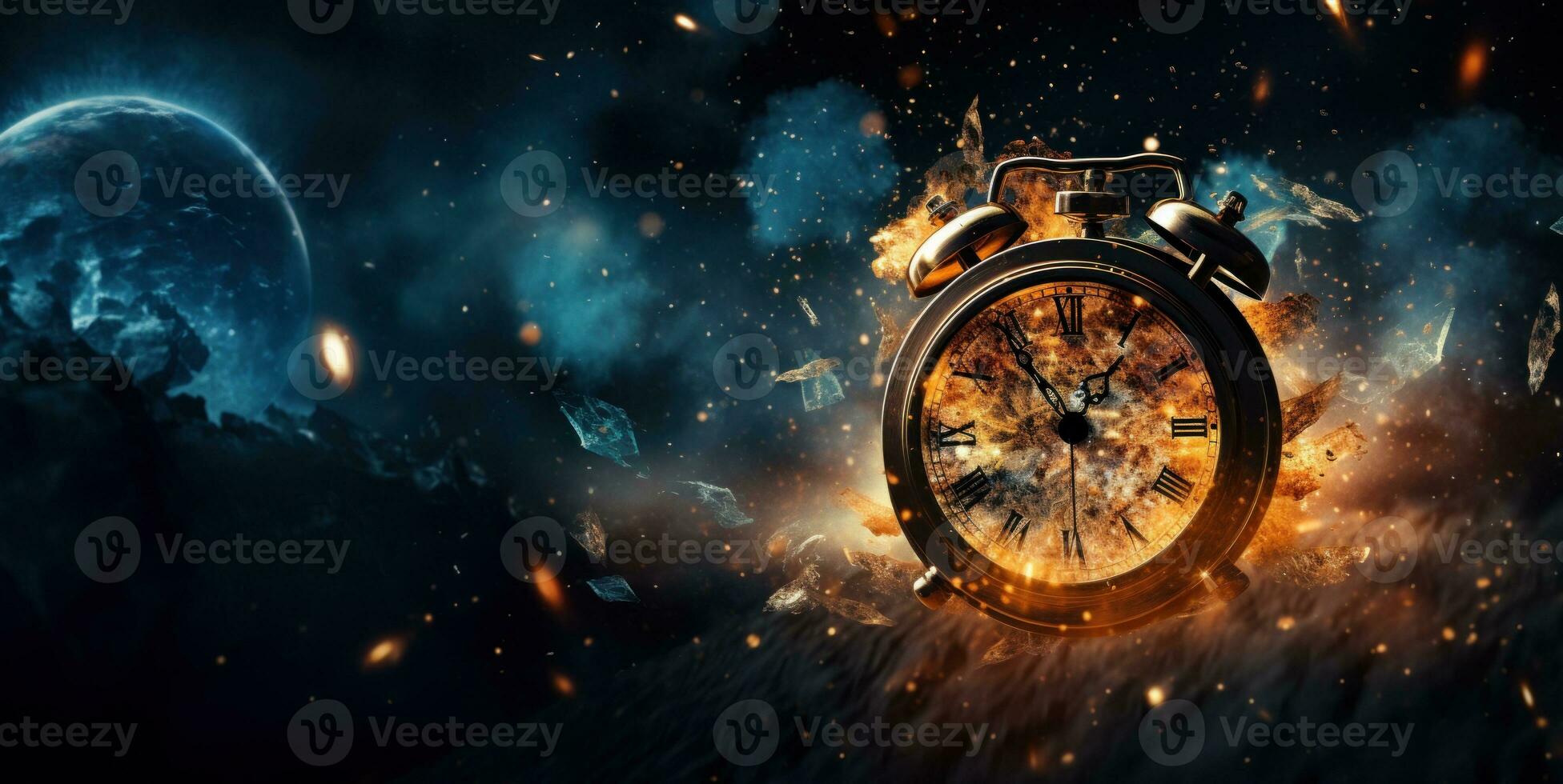 Burning alarm clock on fire background. Time is running out concept. AI Generative Pro Photo