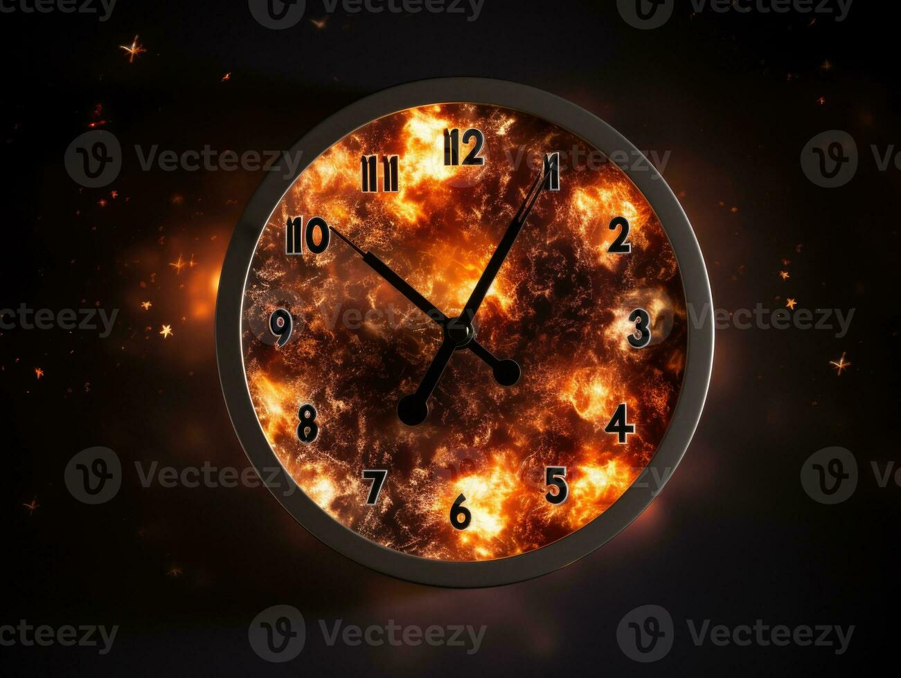 Burning alarm clock on fire background. Time is running out concept. AI Generative Pro Photo