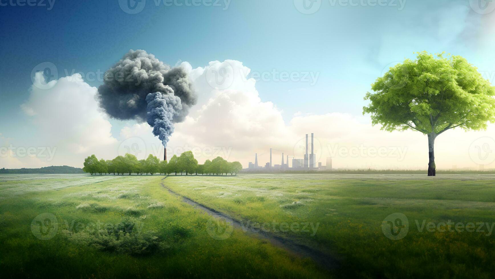 Compare the green tree and meadow clear air field with factory and air pollution with climate change effect. AI Generative. Pro Photo
