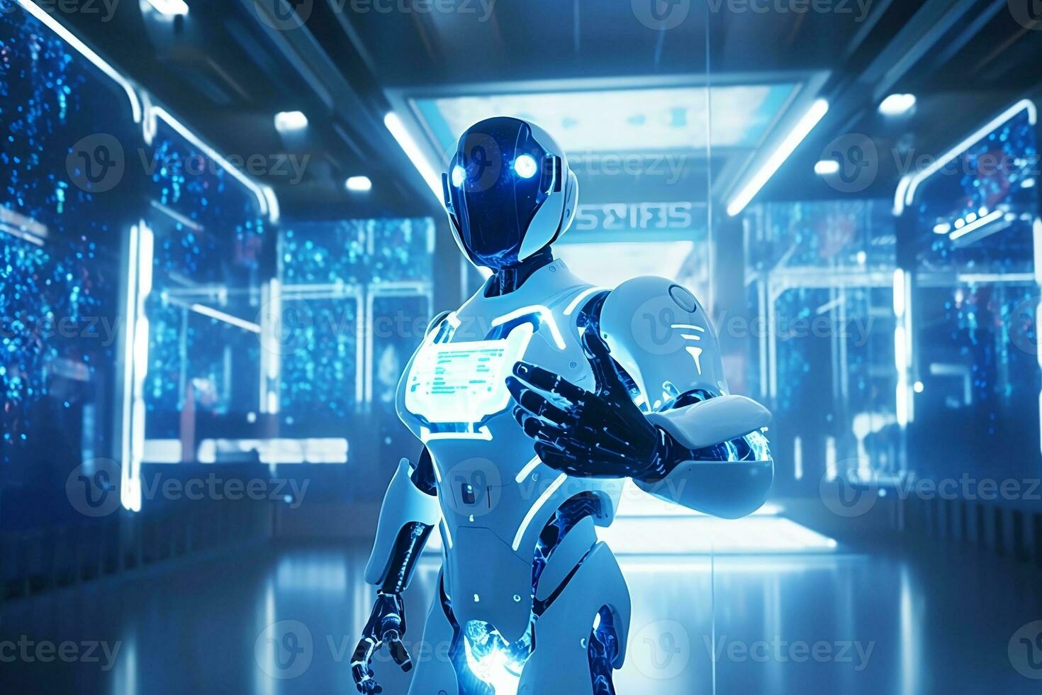 a robot standing in front of a futuristic building. generative ai Pro Photo
