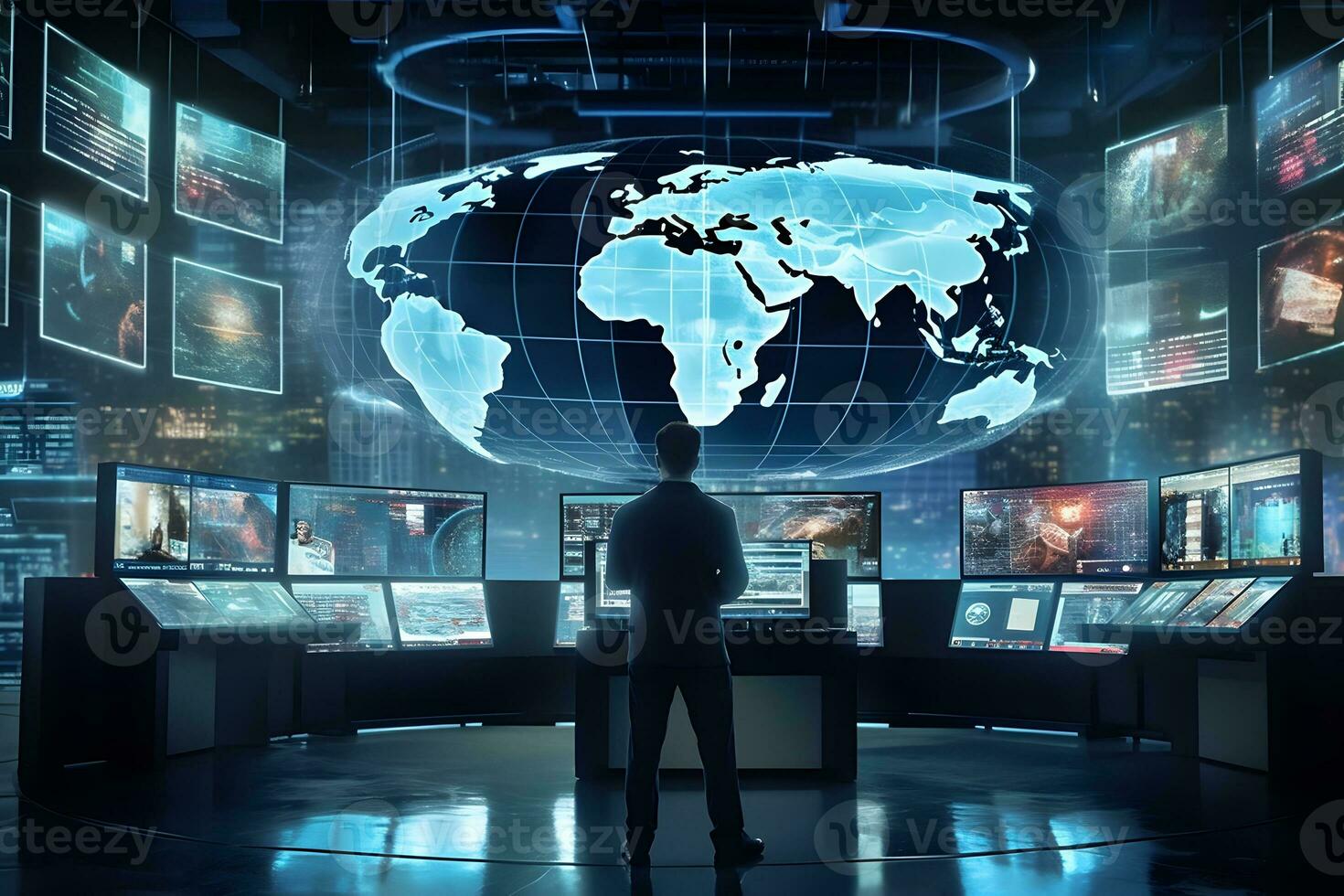 a man standing in front of a large screen with multiple monitors. Generative AI Pro Photo