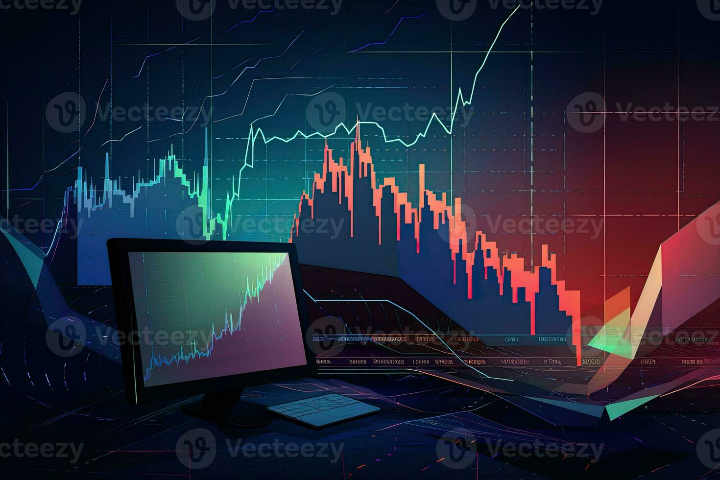 an illustration of a computer screen with a graph and stock market. Generative AI Pro Photo
