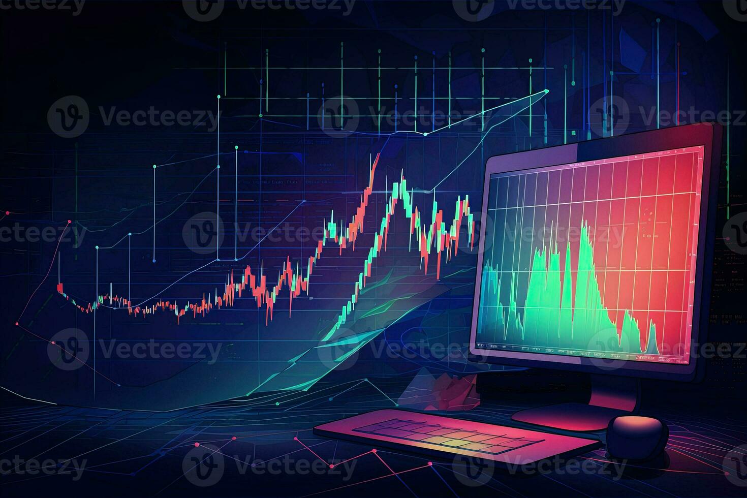 a computer monitor and a screen with a chart. Generative AI Pro Photo