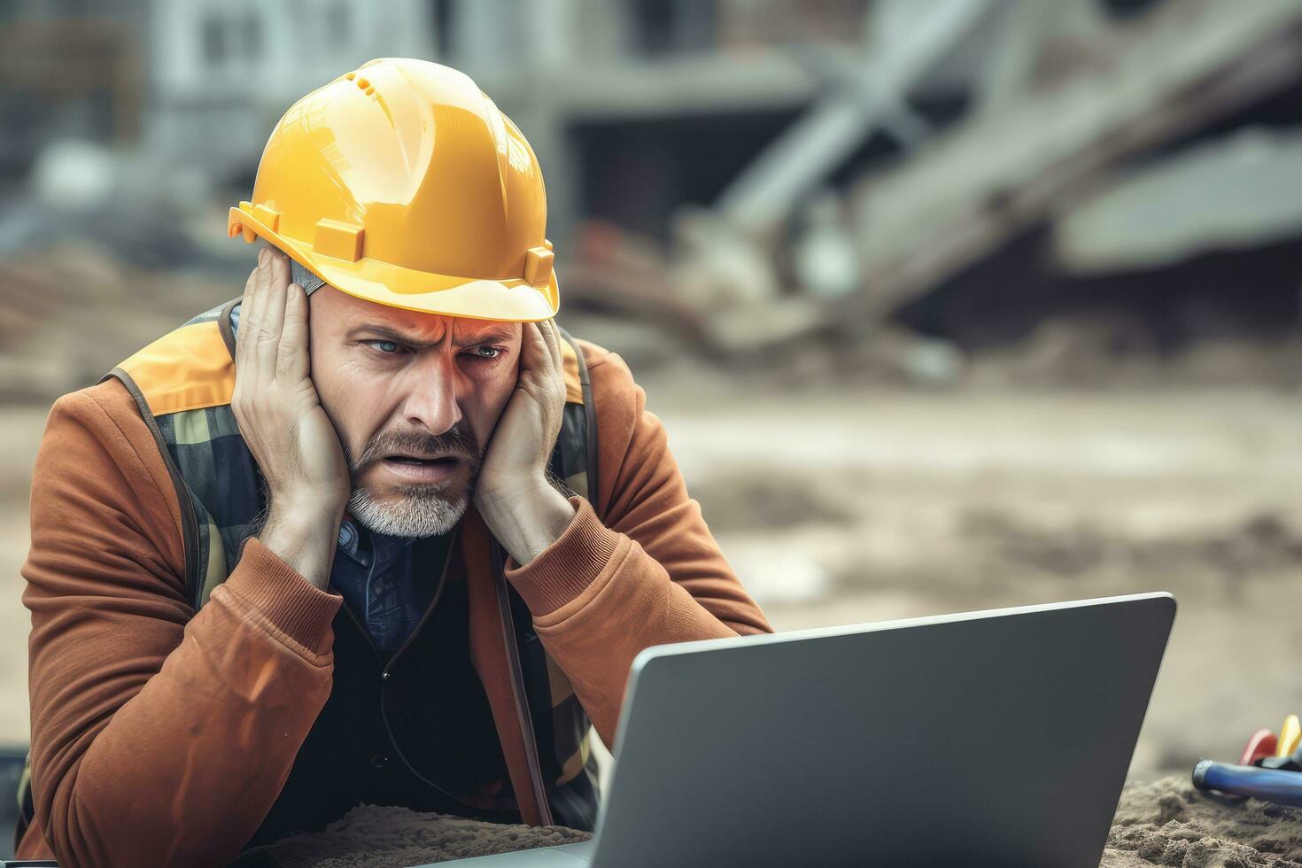 A engineer man stressed , unhappy sad , Background at working site , Generative AI. Free Photo