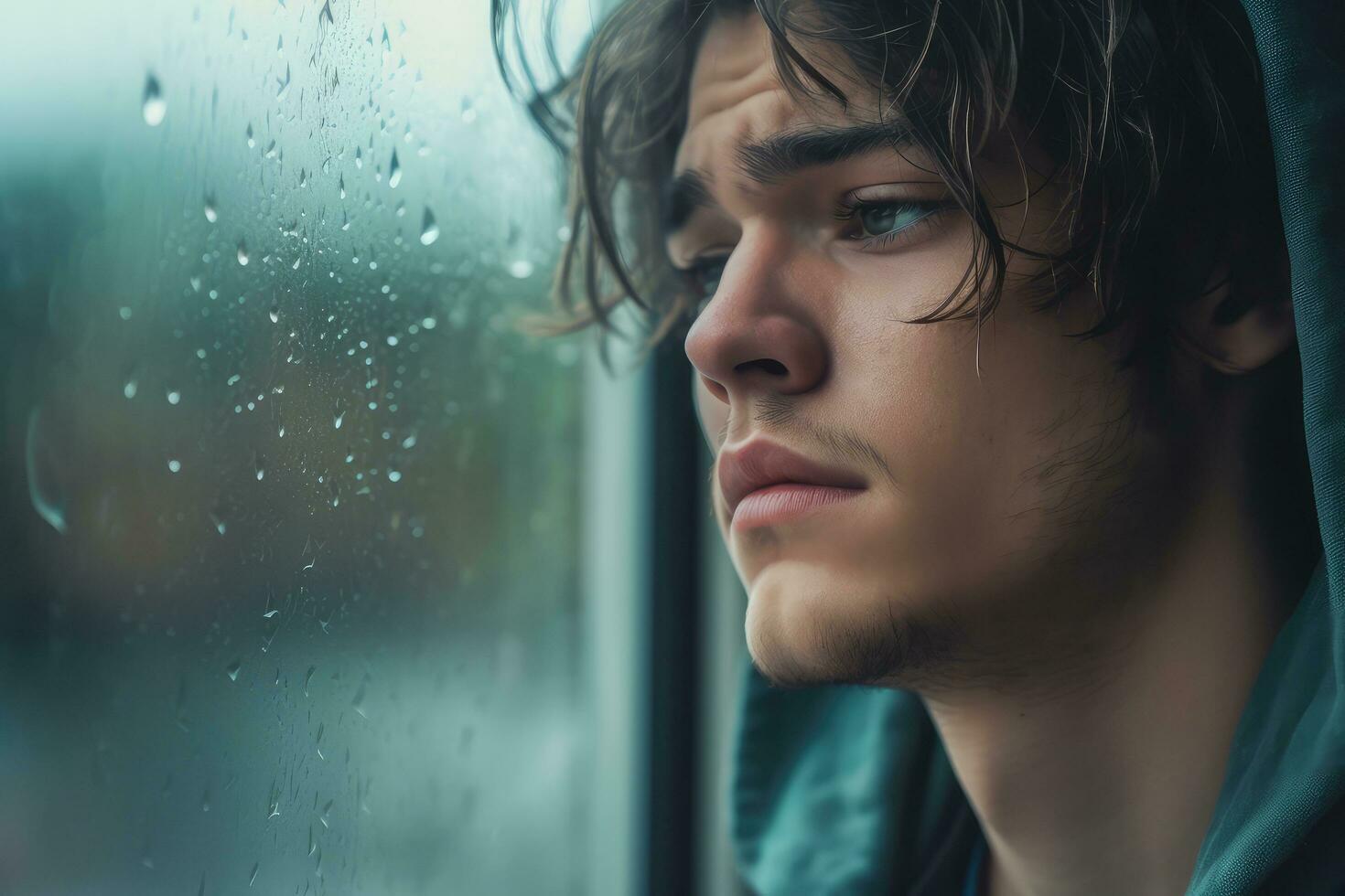 A young man sad of sit on the edge the window with raindrops on the glass window on a rainy day ,Generative AI. photo