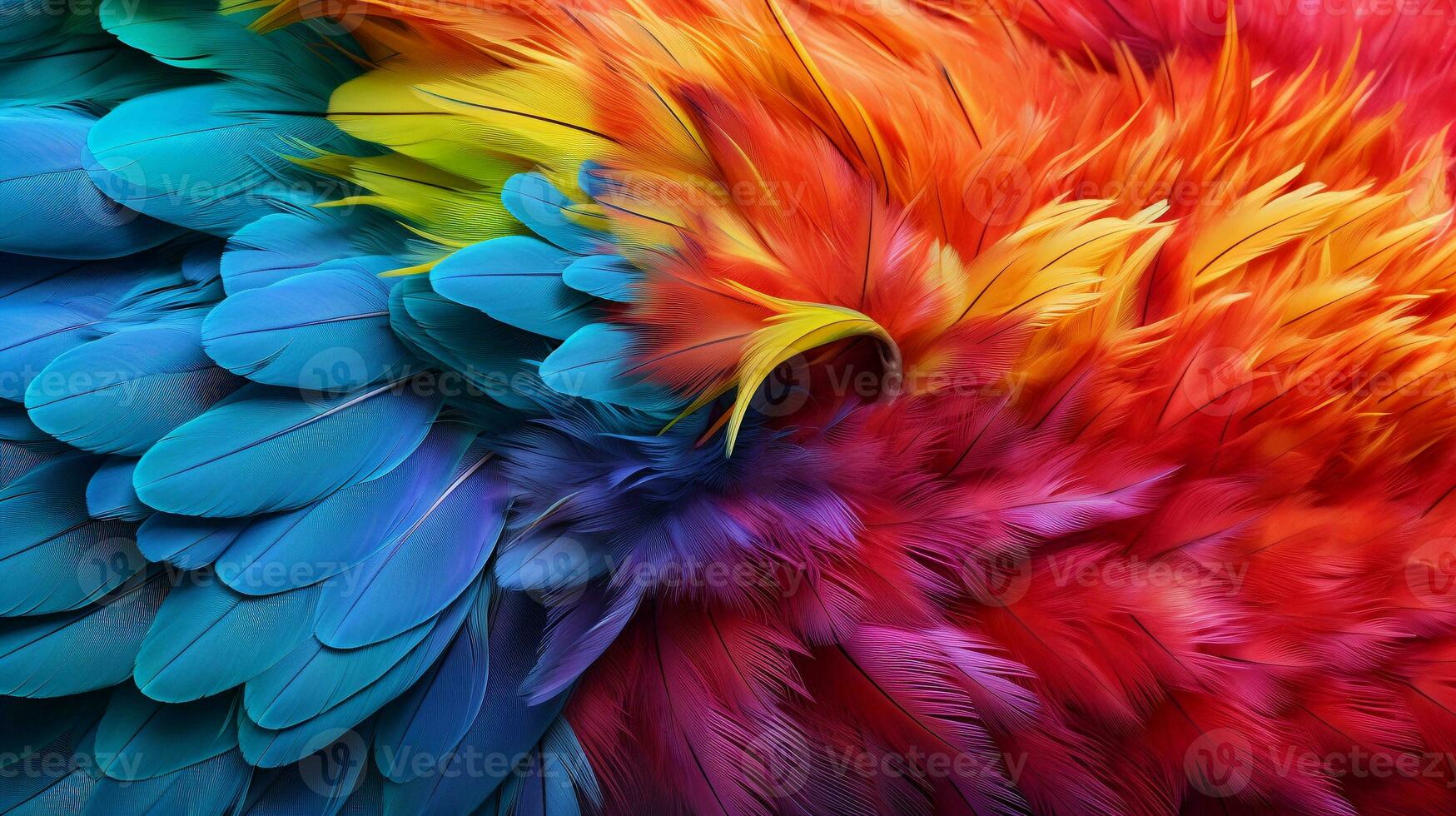 An image capturing a close-up of a parrot's vibrant feathers against a textured backdrop, with designated areas for text. Background image, AI generated Pro Photo