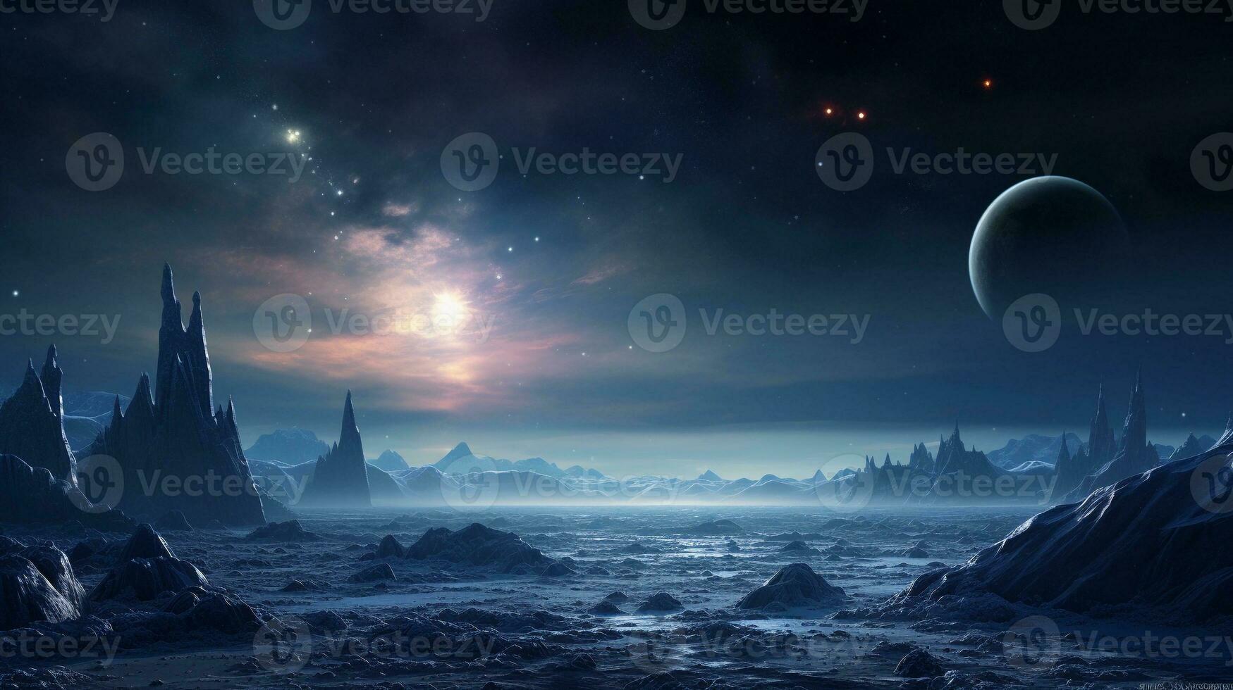 A scene illustrating the discovery and exploration of distant exoplanets within interstellar space, allowing space for text, background image, AI generated Pro Photo