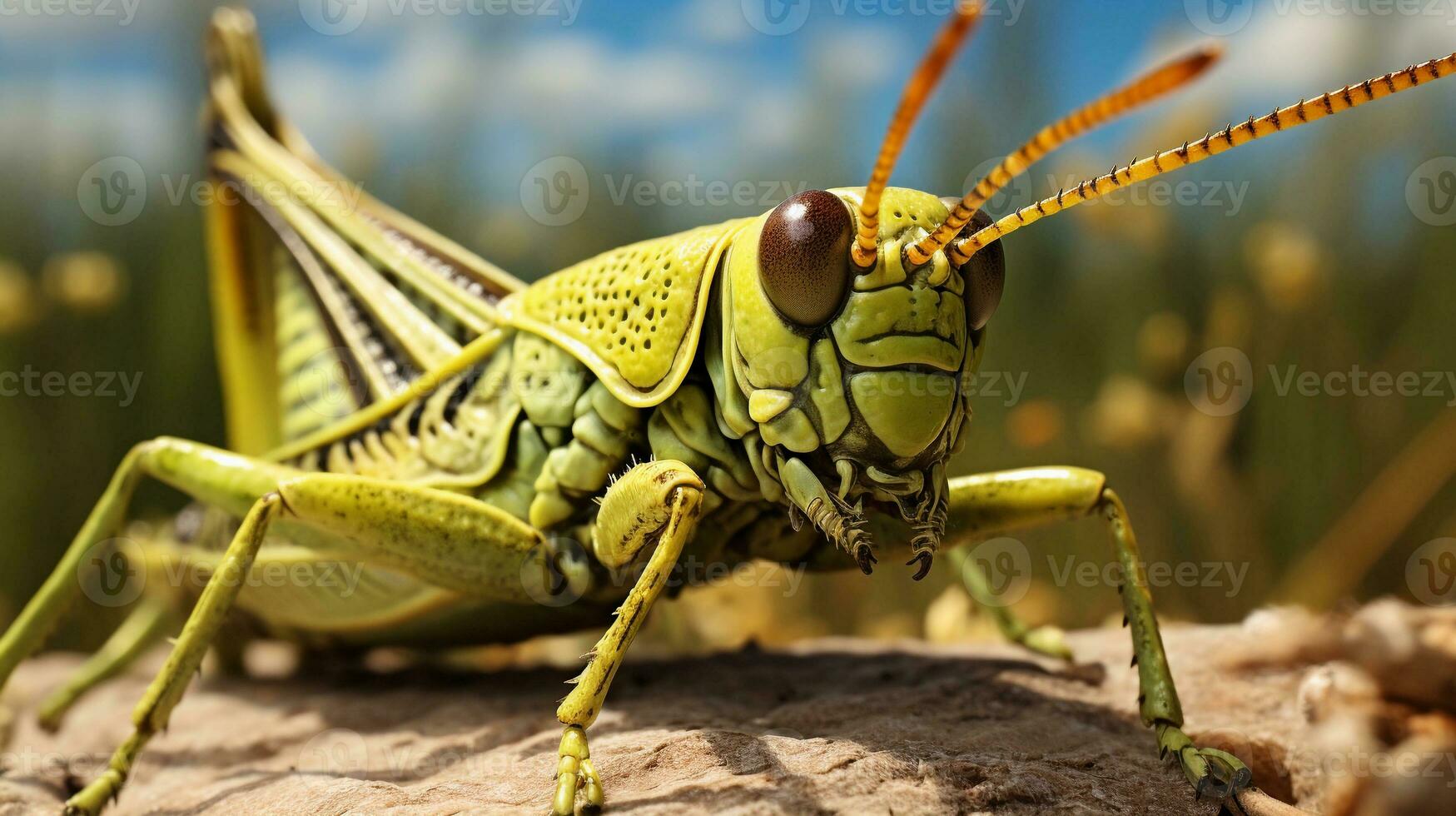 A close-up of a grasshopper with intricate textures on its body, with space for text. background image, AI generated Pro Photo
