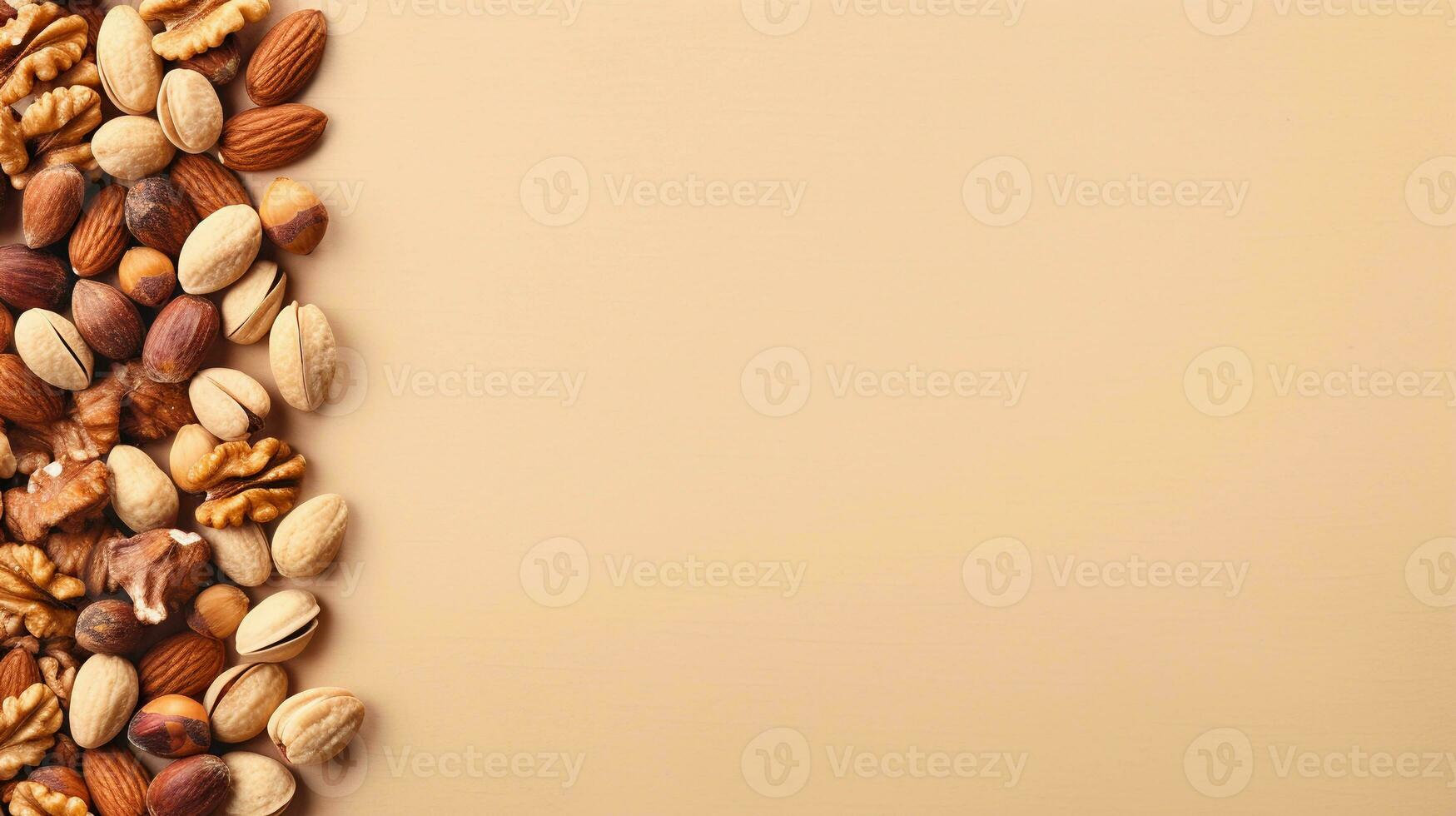 nuts on a light brown background with space for text on the side, background image, generative AI Pro Photo