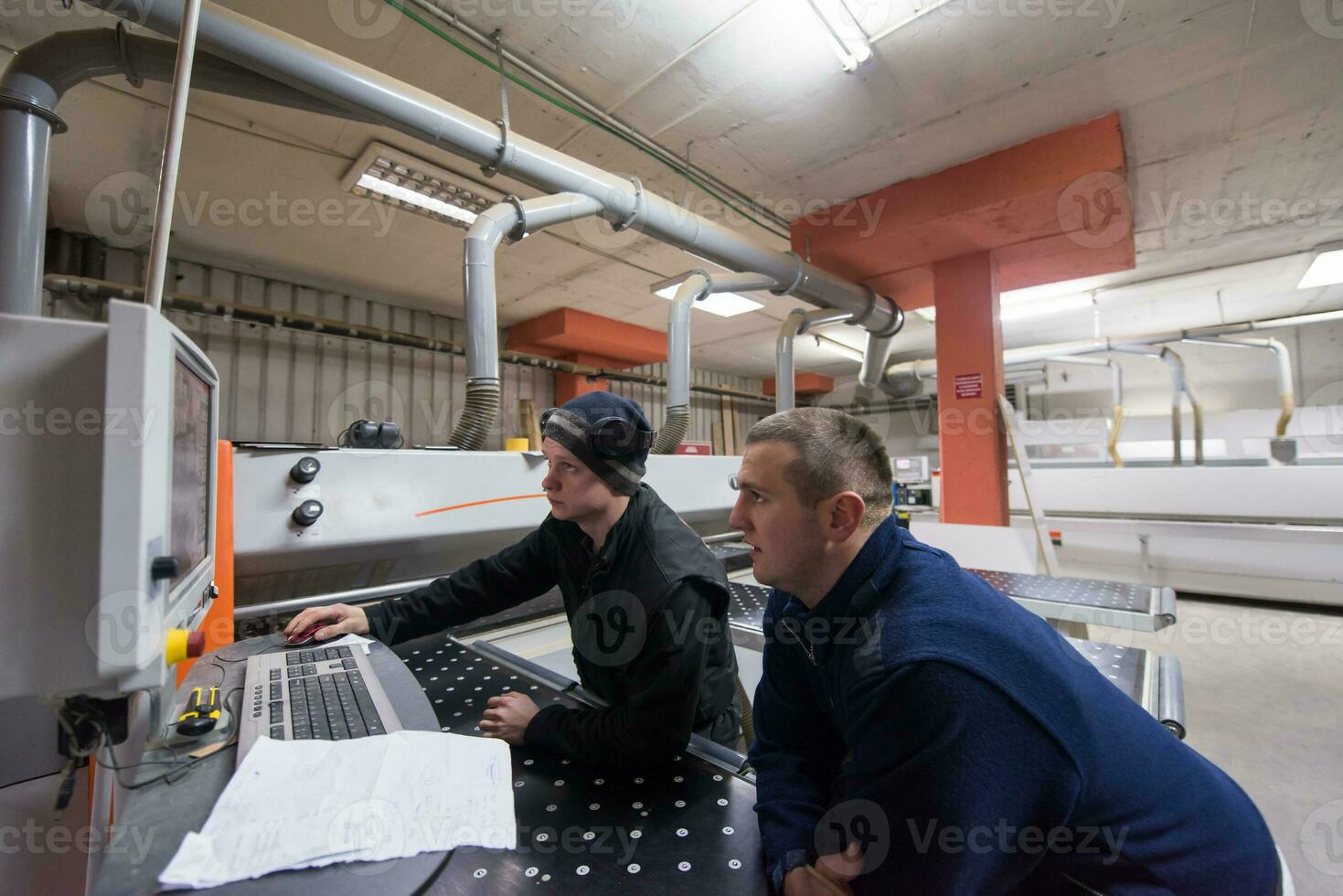 carpenters calculating and programming a cnc wood working machine Pro Photo