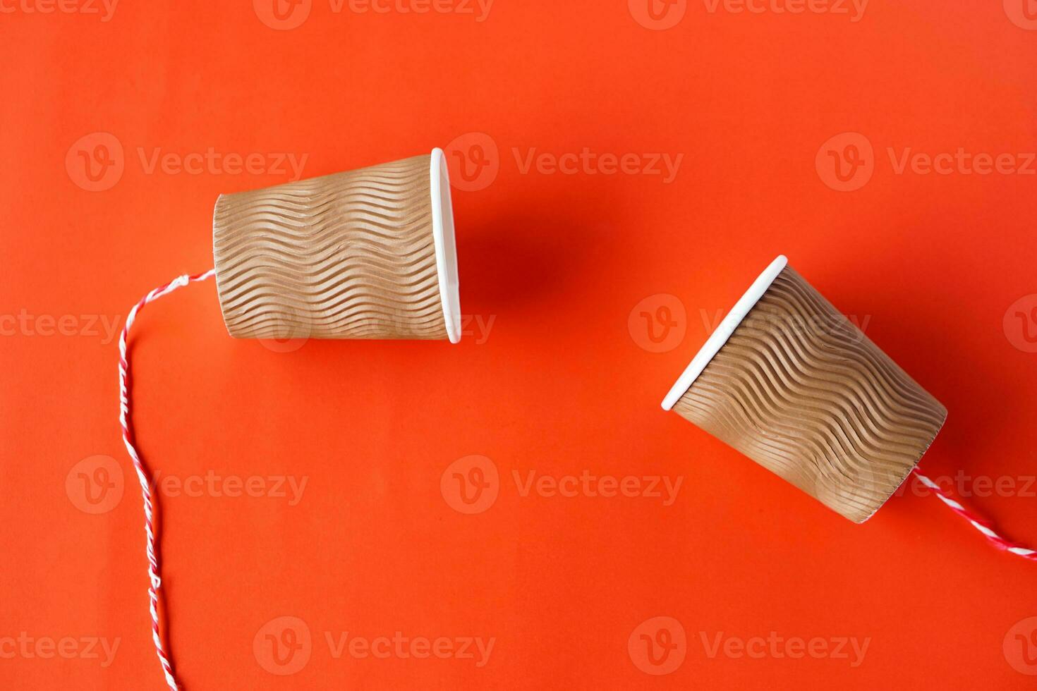 DIY paper cups with string on red background. Concept, telephone toys which apply with science knowledge about vibration sound through straining strings causing us to hear the sound. Pro Photo