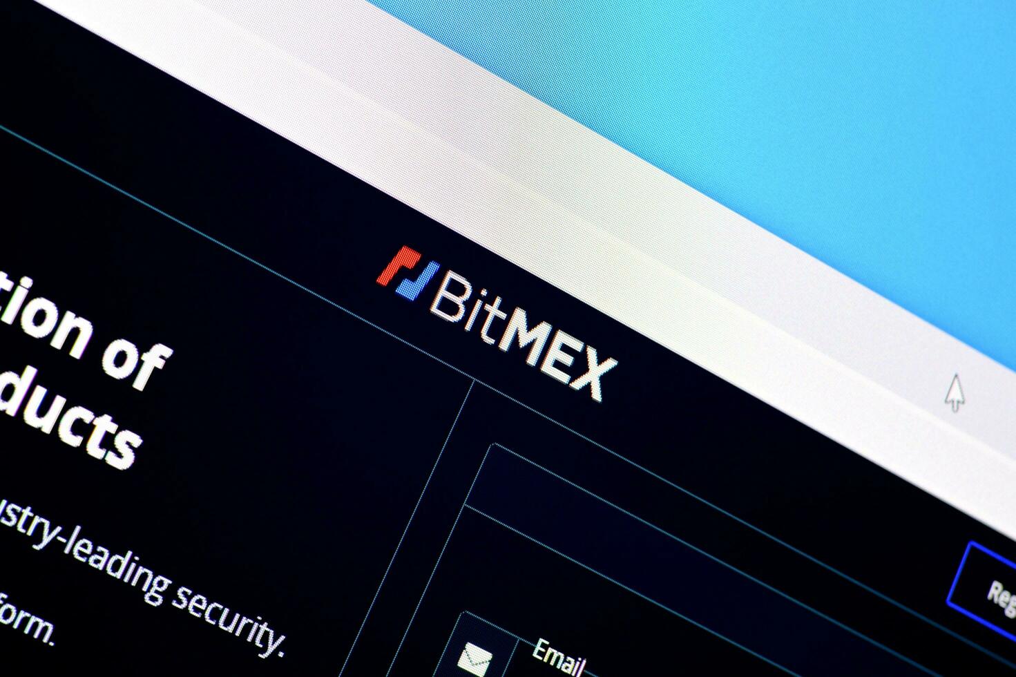 Homepage of bitmex website on the display of PC, url - bitmex.com. photo