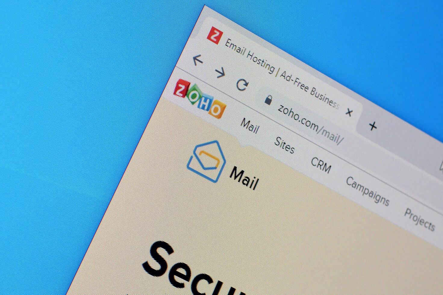 Homepage of zoho mail website on the display of PC, url - www.zoho.com.