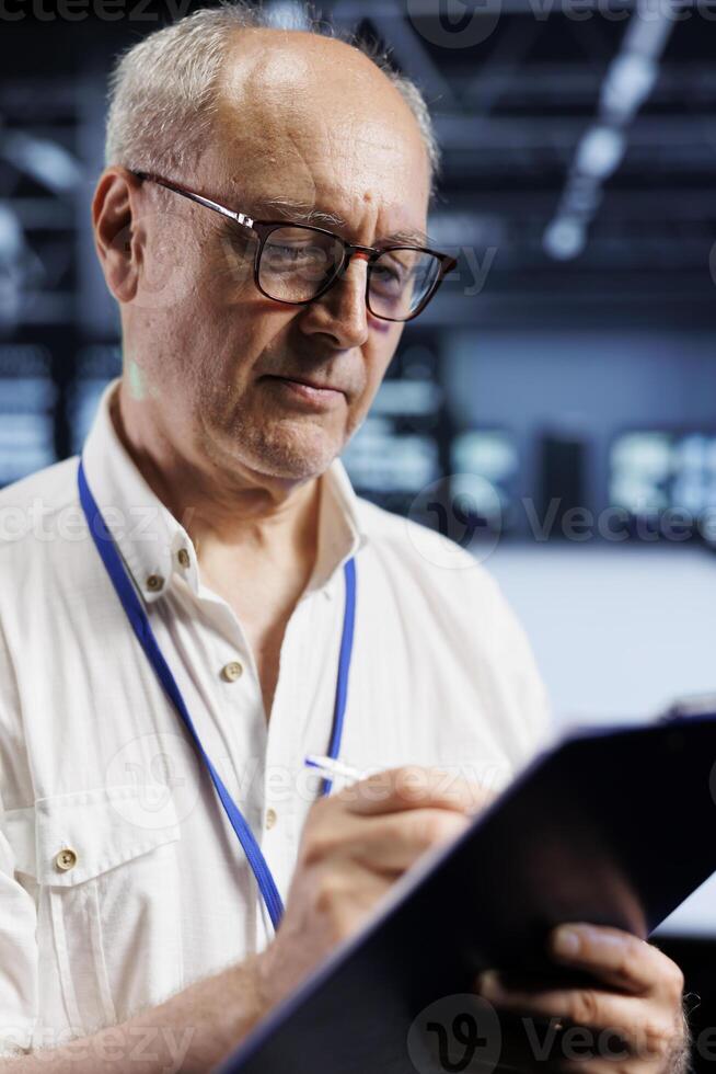 Old technician in cryptocurrency mining farm with specialized hardware using Blockchain technology. Fintech professional holding clipboard, inspecting asic rigs solving complex hashing operations Pro Photo