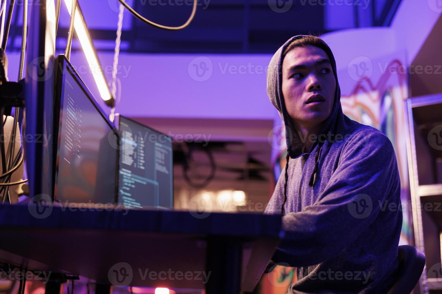 Nervous young man looking over shoulder while breaking law and hacking database in abandoned warehouse. Scared asian hacker in hood afraid of police while coding illegal malicious software Pro Photo