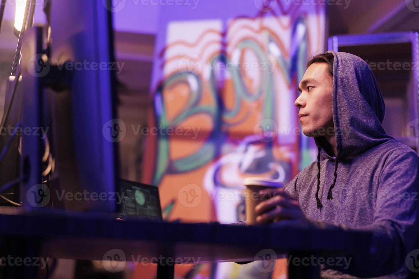Hacker in hood cracking database password and drinking takeaway coffee. Young asian criminal looking at computer screen and holding beverage to go while coding internet virus malware Pro Photo