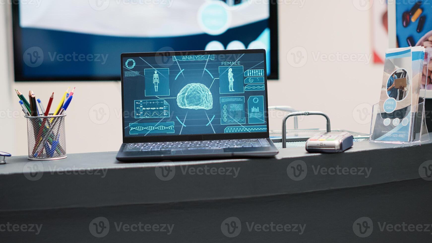 Laptop with brain x ray scan on counter, neuroscience radiography running on screen in empty reception area. Medical facility with front desk and neural system tomography. Close up. Handheld shot. Pro Photo