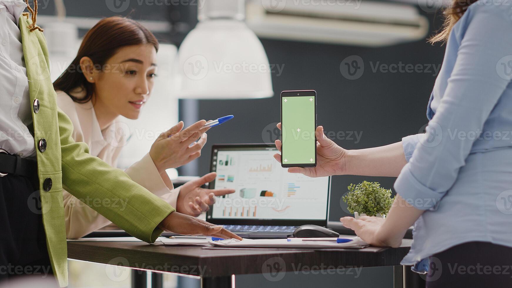 Diverse group of employees working with greenscreen on smartphone, using isolated display with chroma key. Startup workers checking mockup template in business coworking space. Handheld shot. Pro Photo