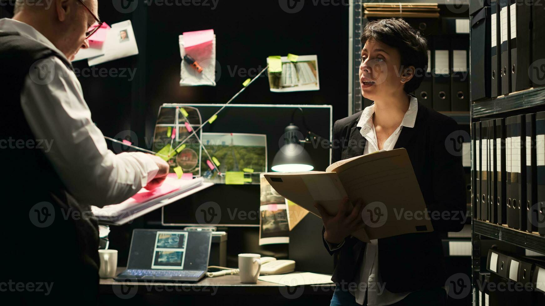 Detectives team reviews classified documents and confidential reports to gain access to restricted information relevant in solving case. Partners discussing about suspect patterns. Pro Photo