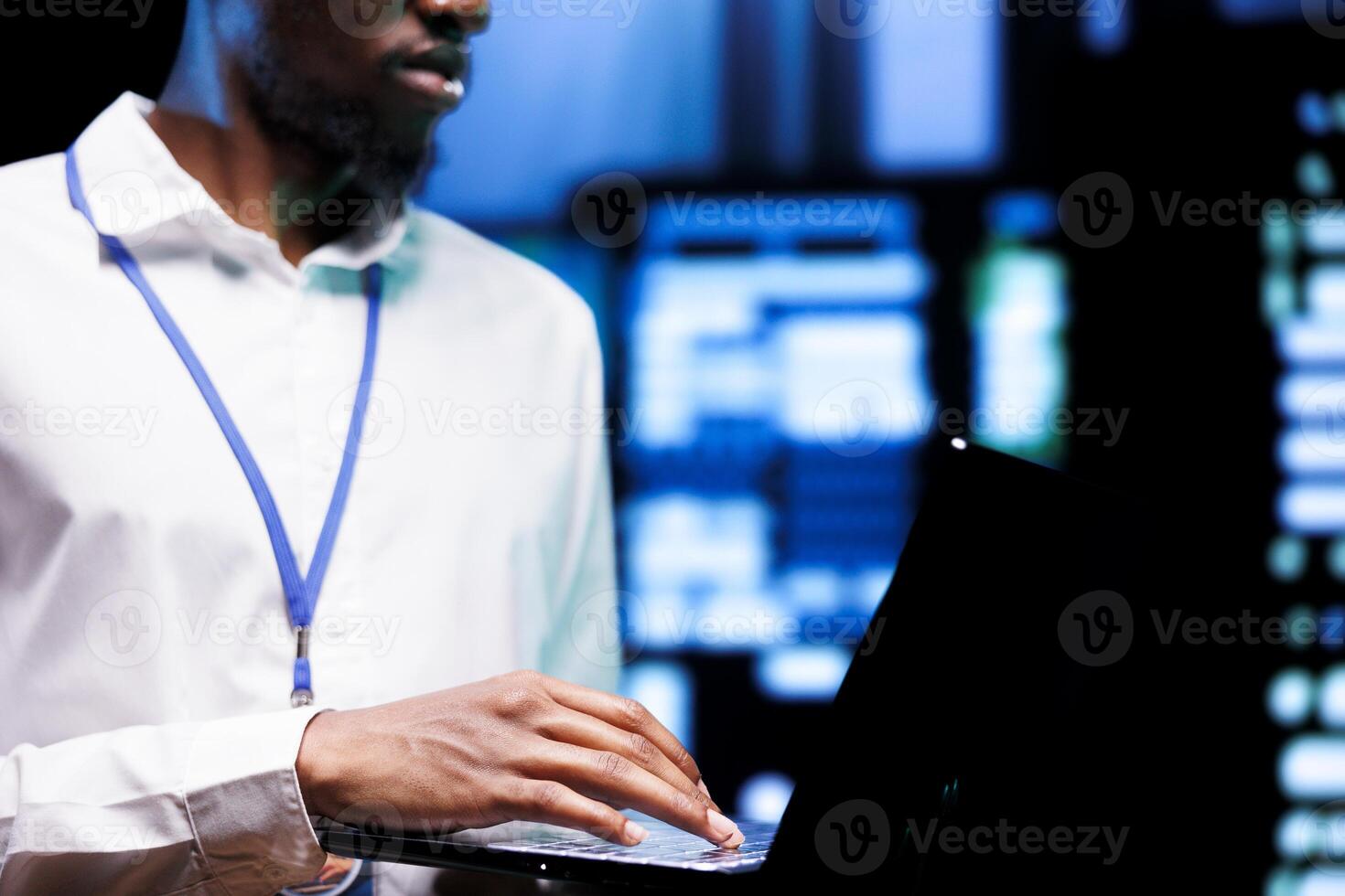 Engineer using laptop to optimize VPN servers with top security standards used to protect sensitive data. Technician working in enterprise data business providing online connections for users Pro Photo