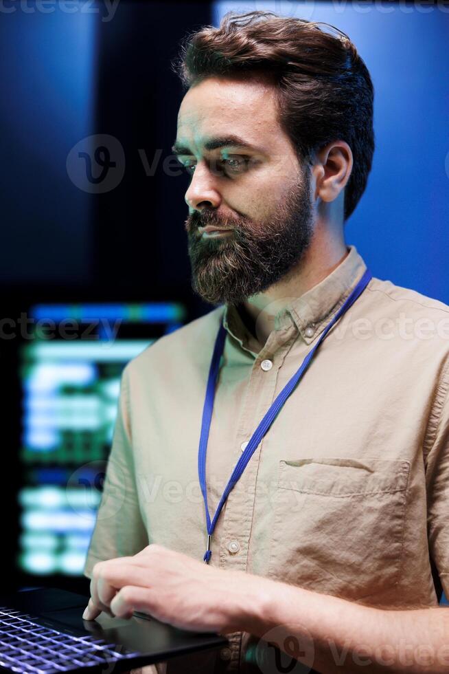 Skillful engineer using laptop to find flaws in data center components doing complex calculations. Server rigs processing massive datasets for machine learning and AI applications Pro Photo