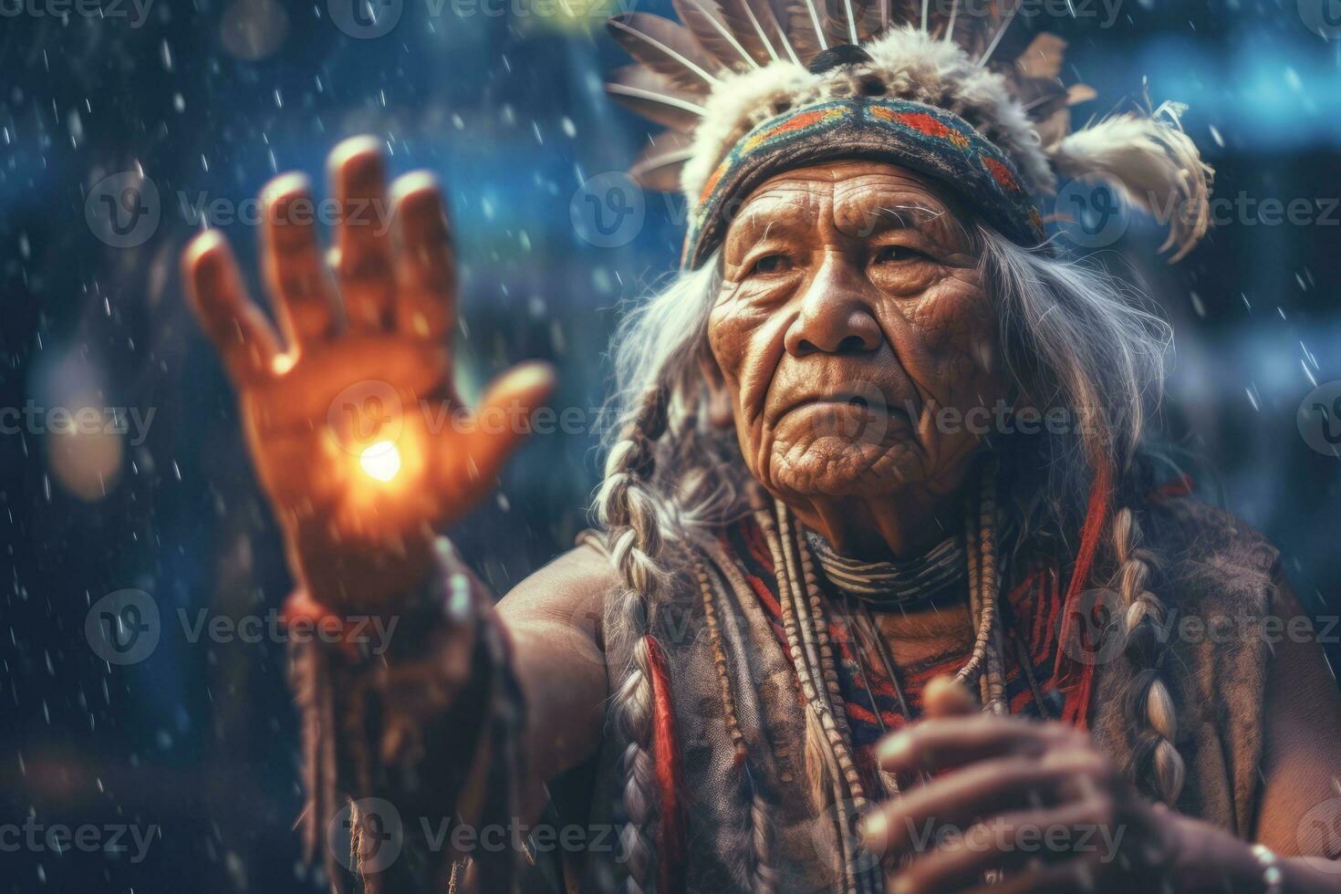 A serene image featuring an indigenous elder or shaman imparting wisdom to younger generations, emphasizing the deep connection with nature and ancestral knowledge. Generative Ai Pro Photo