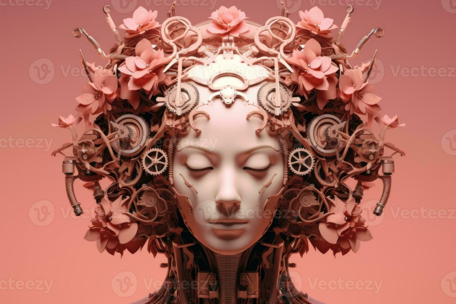 Image of a robot woman head with gears and machinery. Generative AI Pro Photo