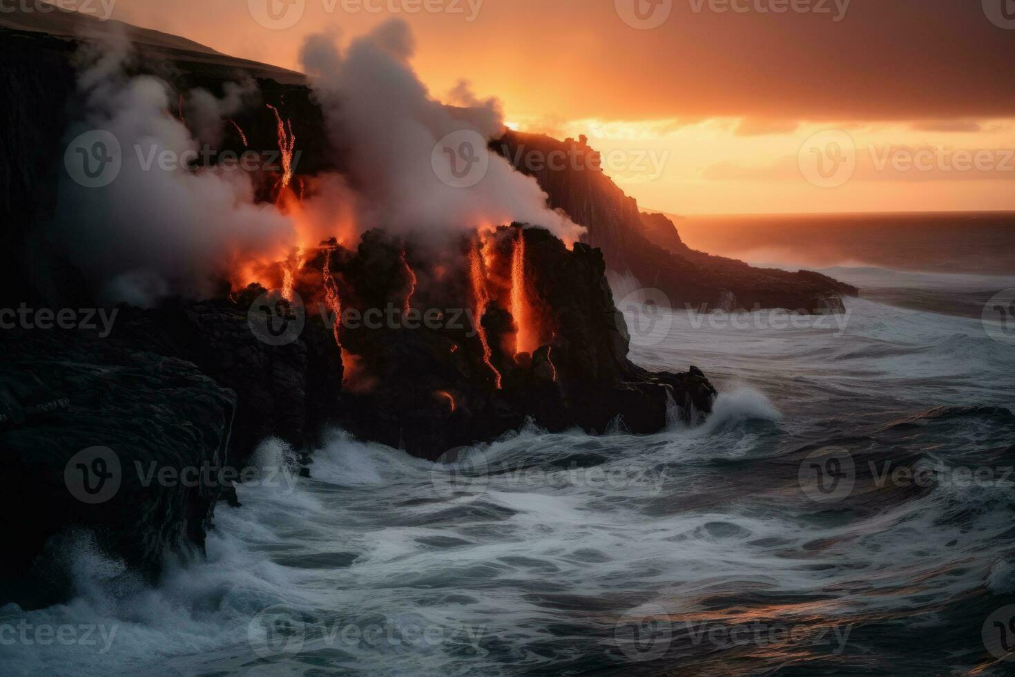 Volcanic cliffs jutting up from churning ocean waves, with lava flows spilling into the sea and smoke billowing upwards into a vibrant sunset sky.. Generative AI Pro Photo
