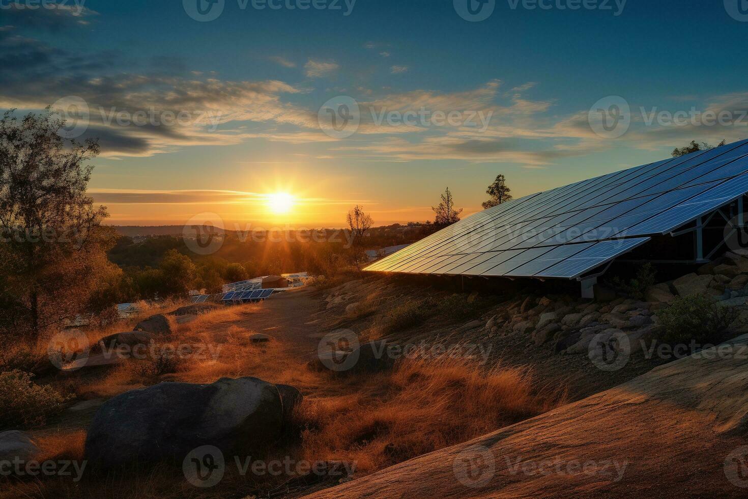 Large solar power plant with rows of photovoltaic panels neatly arranged against a clear blue sky. Representing the harmonious integration of different renewable energy sources. Generative AI. Pro Photo