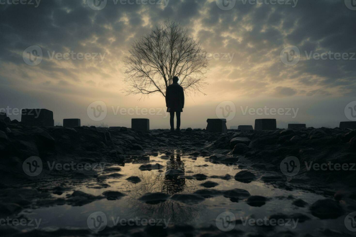 A powerful image of a lone figure standing in front of a gravestone, reflecting on memories and emotions, symbolizing the journey of grief. Generative AI Pro Photo