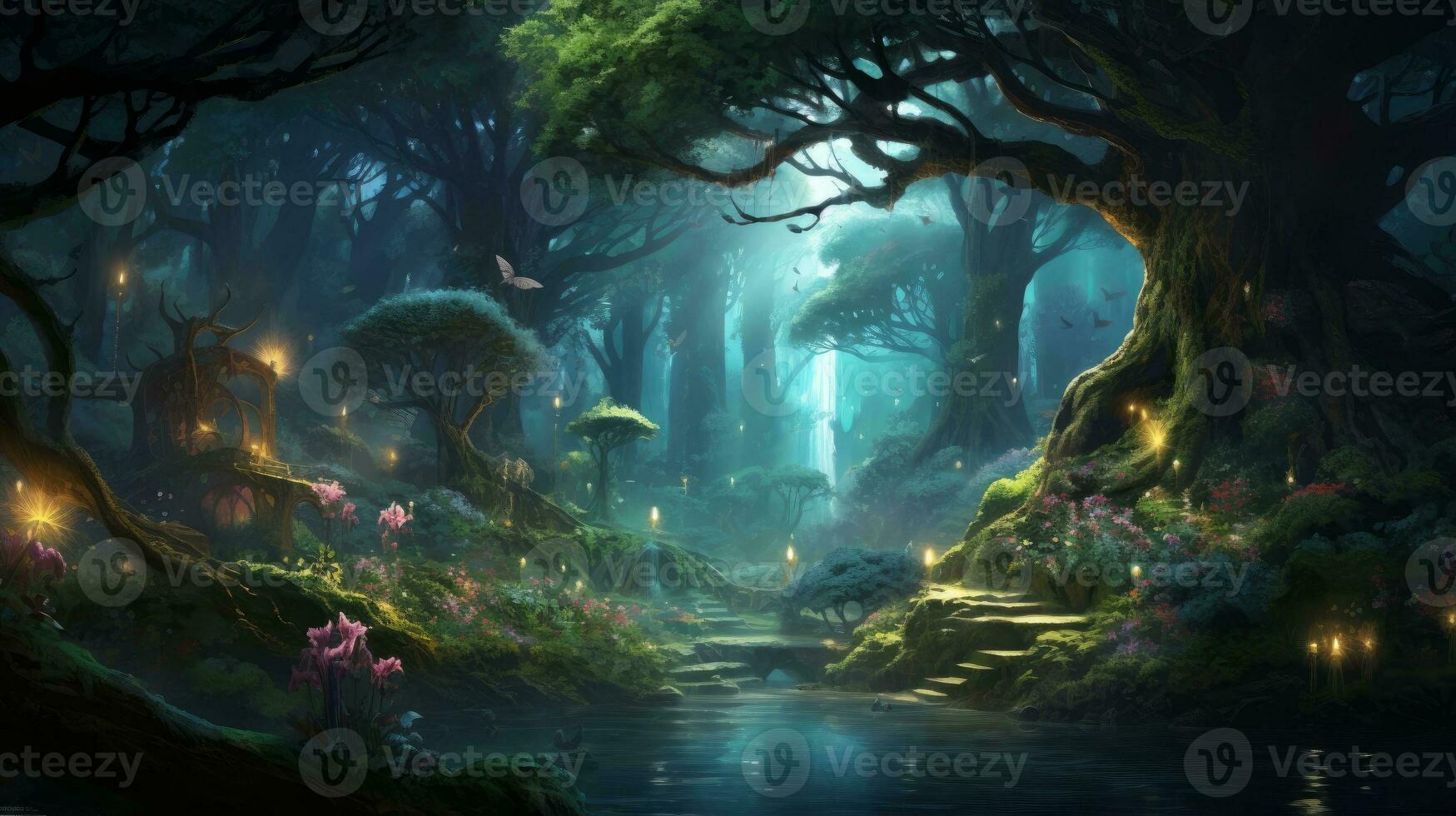 Mystical forest with fairies and sparkling magical elements. Generative AI Pro Photo