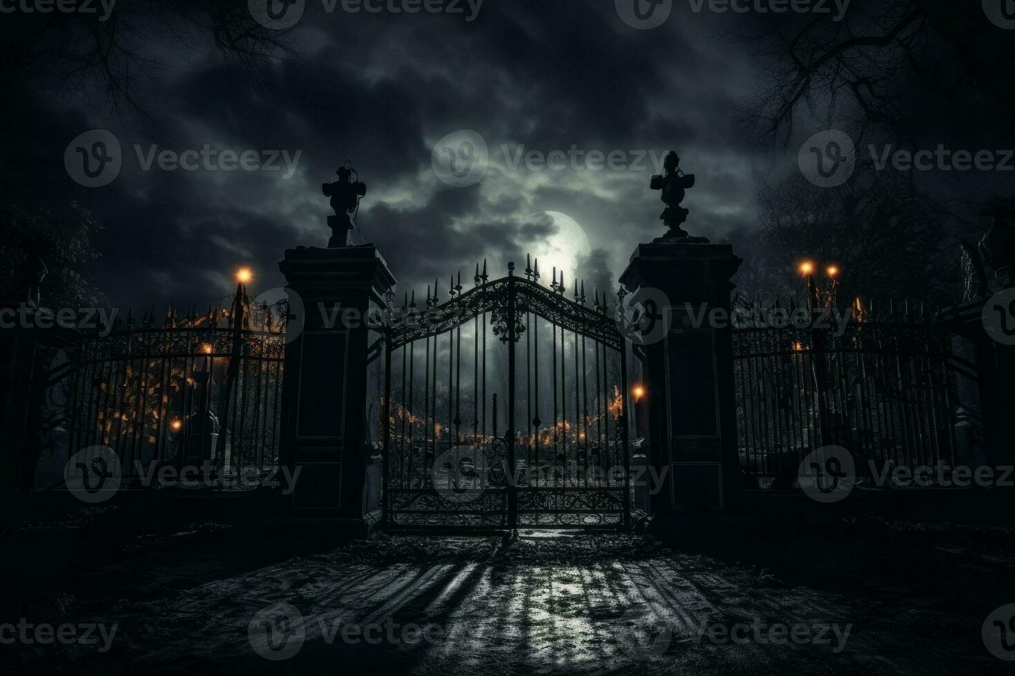 Dark gate with a full moon in the background. Generative AI Pro Photo