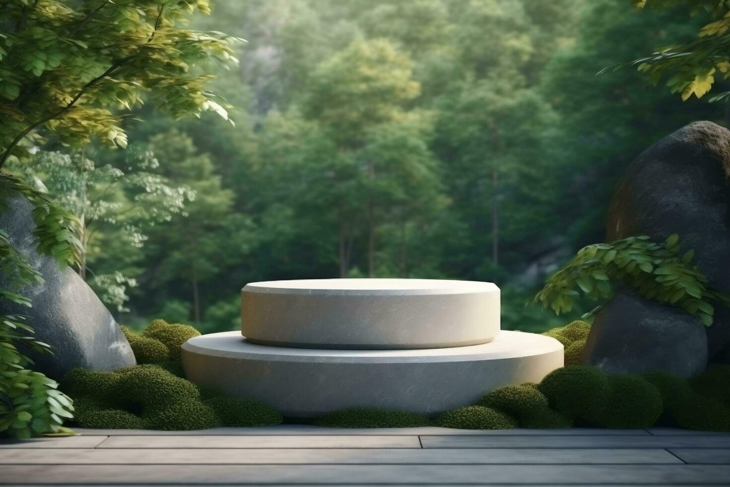 3d rendering stone product display podium for product with green nature garden background ai generated photo