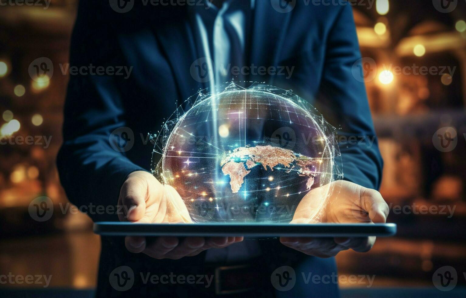 Hands, business, and tablet for SEO hologram, networking, and 3D global graphic research. Overlay of a worker, person, or digital technology of the globe for a search engine. AI Generative Pro Photo