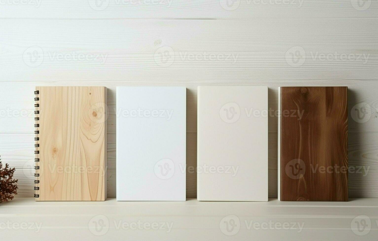 Notebooks on a wooden shelf against a white wall banner background. Make a copy of the space. AI Generative Pro Photo
