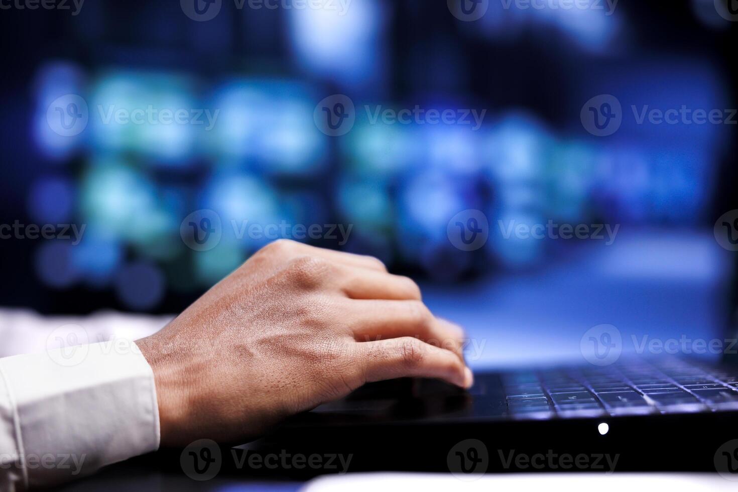 Close up shot of employee in server farm using laptop to set up configuration management tools that enable automatic failover and load balancing, preventing supercomputers system crash Pro Photo