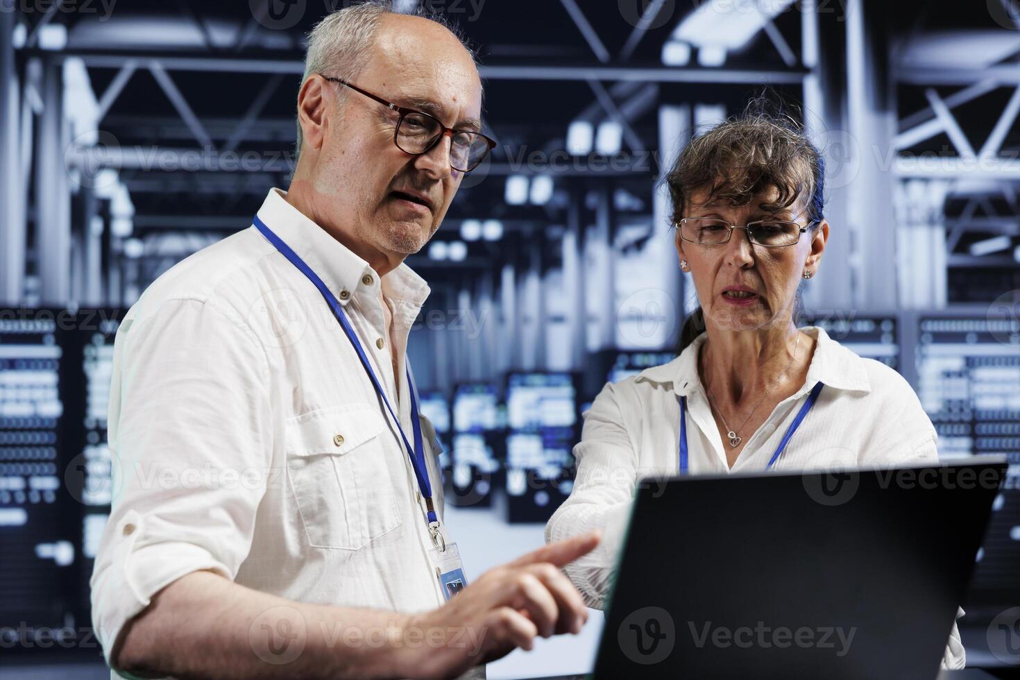 Old engineers preventing strain on data center gadgets caused by AI applications driving up power usage. Knowledgeable technicians maintenancing server racks doing intense computations Pro Photo