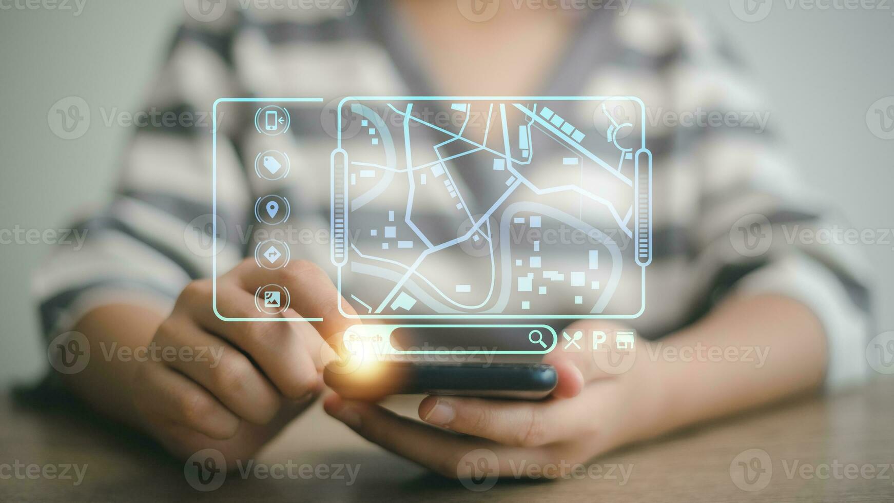 Women use smartphones to search maps with geolocation points. Synchronize GPS, Mark destination trip app and find business places by online map system, Exploring target location Pro Photo