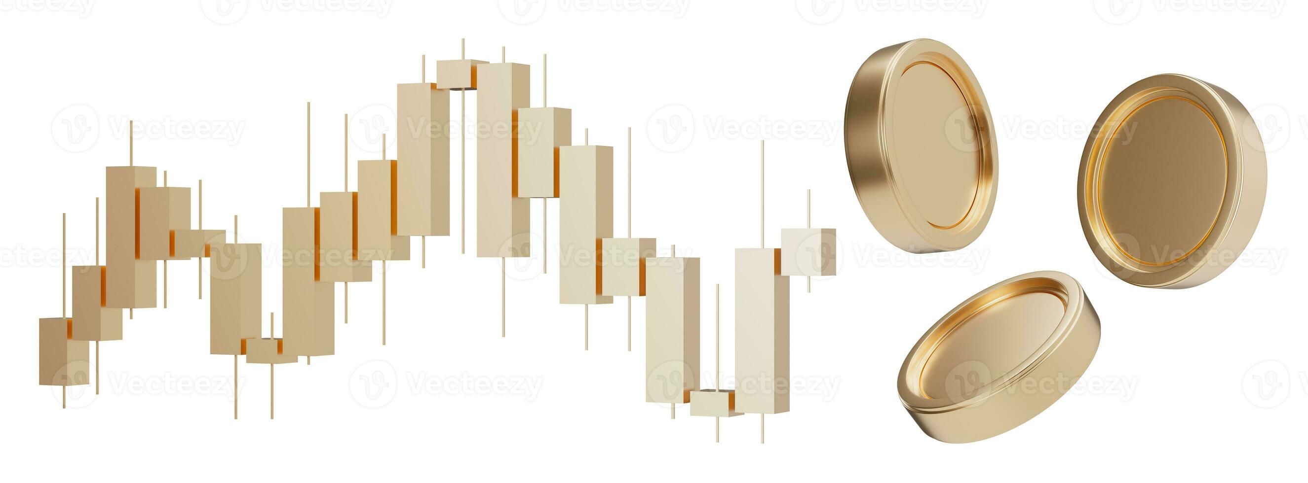 Golden trading chart and coins isolated on white background. Stock trade data on graph with japanese sticks. Financial diagram with assets values moving up and down. Cut out elements group. 3D. Pro Photo