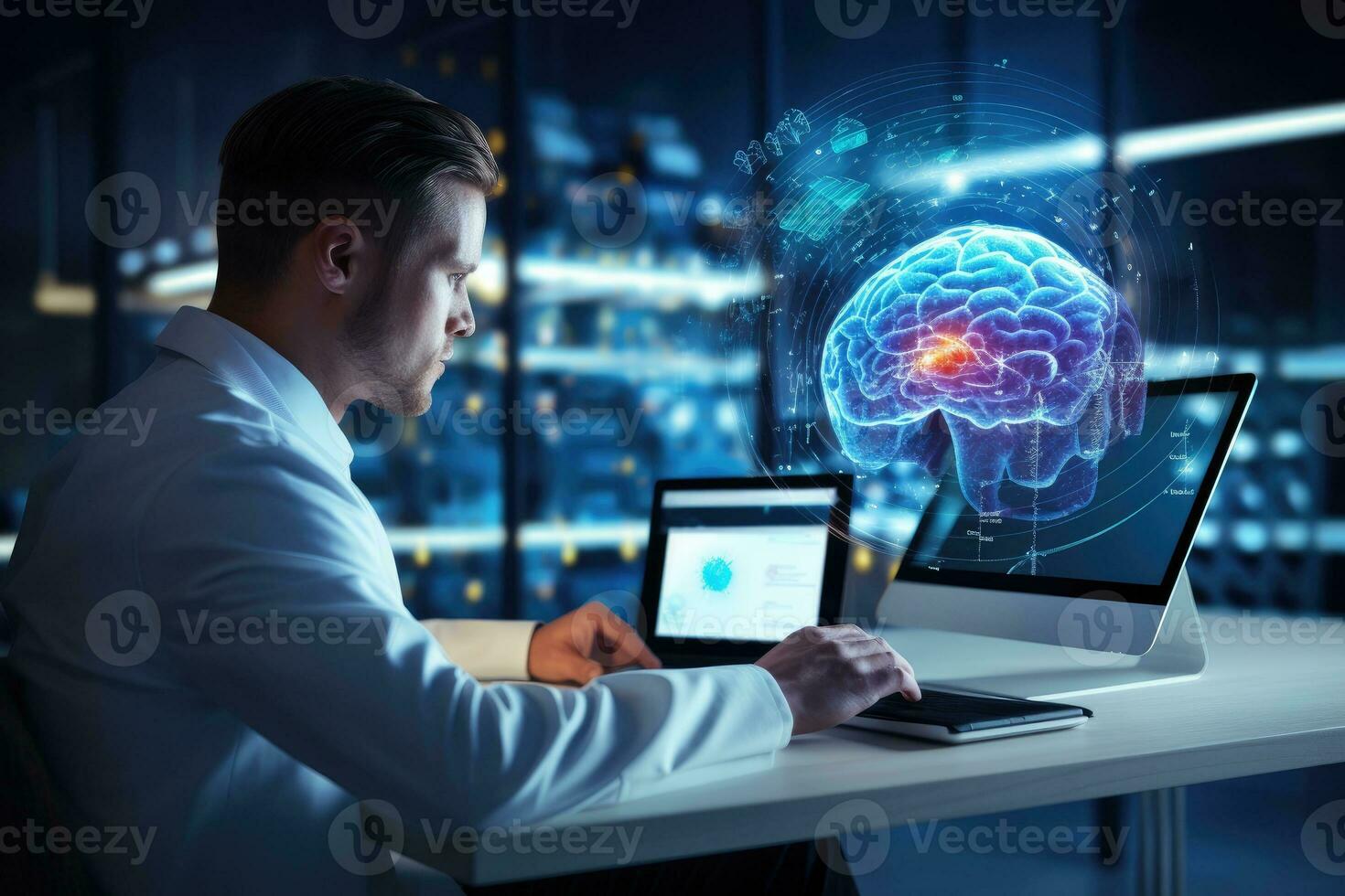 business, people and technology concept - close up of businessman with laptop computer and human brain in office, Doctor checking brain testing result with computer interface, AI Generated Pro Photo