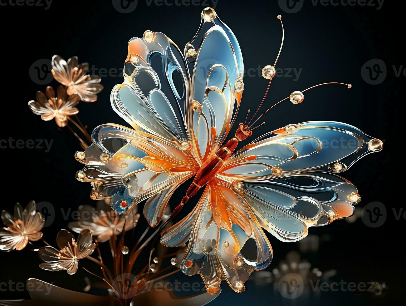 3D illustration of an abstract flower with a butterfly on a dark background AI Generative Pro Photo